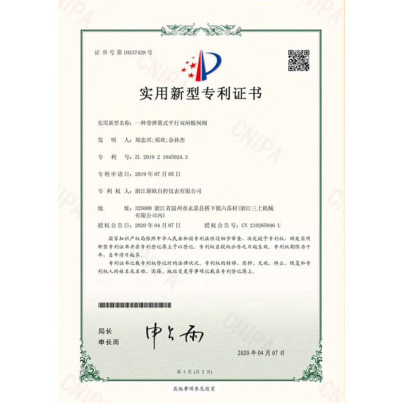 一種帶彈簧式平行雙閘板閘閥 專利證書